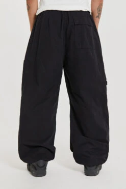 Designed with an oversized fit and a combination of metal eyelets, zip fly and adjustable cotton drawcord, our Black Parachute Cargo Pants deliver refined luxury and ultimate comfort. Details such as a pleated knee and inside leg darts ensure a perfect fit, while a six-pocket styling and a unique airpod pocket provide functional convenience. Elevate any look with this timeless and classic silhouette.
