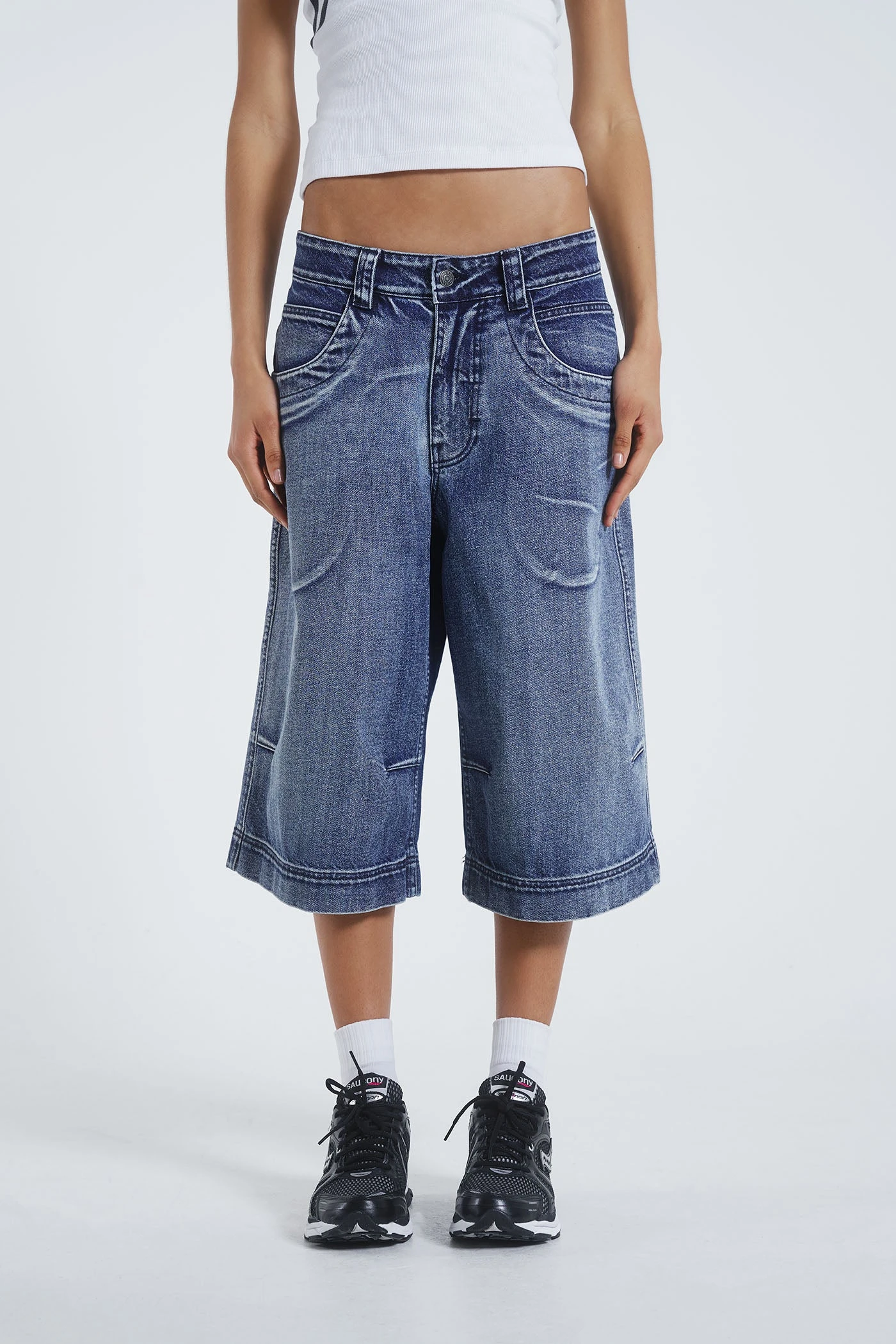 Introducing the Axle Acid Wash Denim Jorts: Crafted from light blue denim, these jorts boast a jumbo fit, belt loops at the waistband and knee darts.