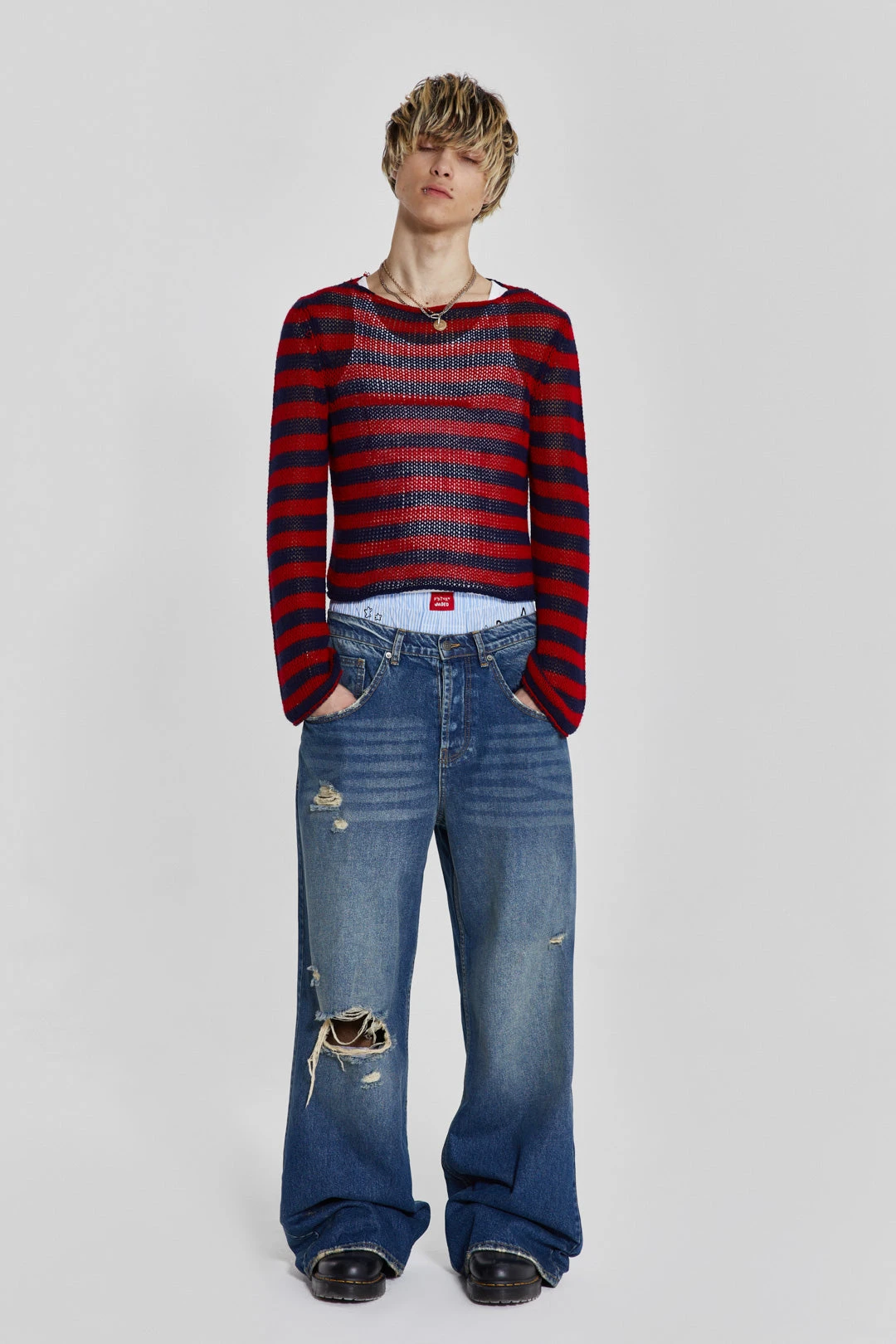 Introducing the Menace Knit, featuring a regal red and navy stripe, this piece is crafted from a slightly brushed yarn. Finished with a slash neck, cast off finish, roll hem and sleeve with a slight flare.